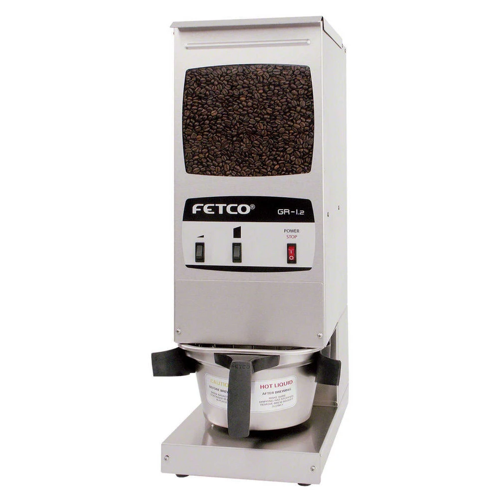 Fetco GR 1-2 Single Hopper Portion Control Coffee Grinder with 2 Portion Control Settings. The GR-1.2 grinder features a user-friendly interface with 15 lbs. single hopper capacity that grinds directly into the brew basket for quick, easy, and consistent grind profiles every time.