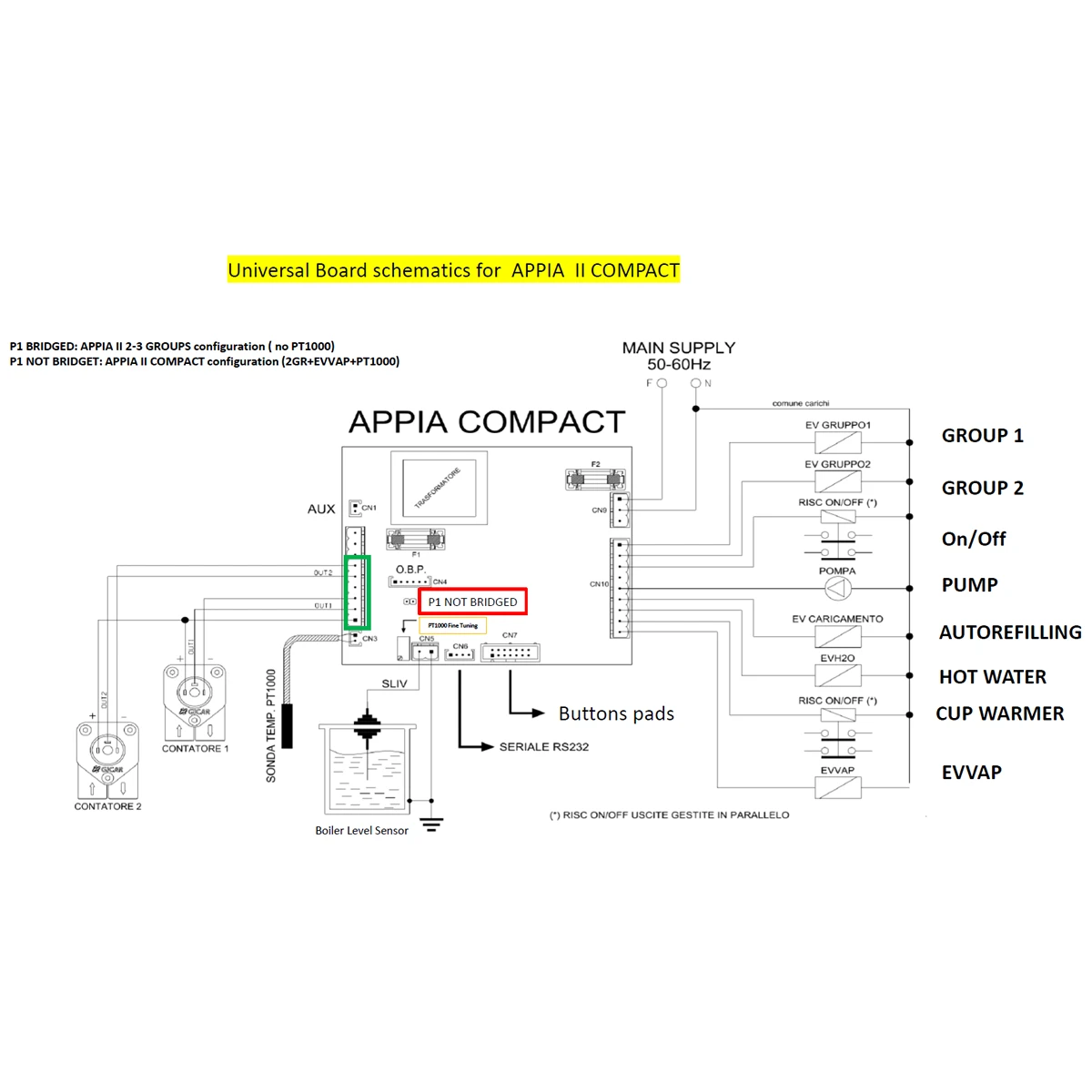 230 volt version for the Appia, Appia II two and three group version “V”, as well as the Appia and Appia II Compact, “V” for volumetric. Simonelli #04900726.U. This replaced old part numbers 04900732, 04900733 and 04900740. Be sure to inspect the electrical diagrams provided for your specific model.